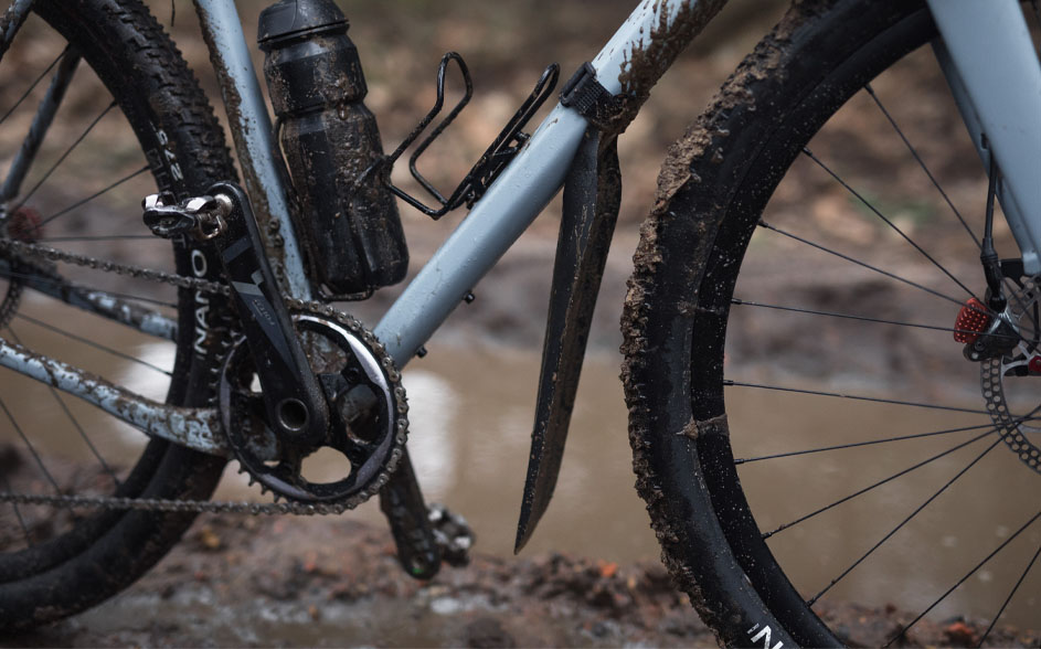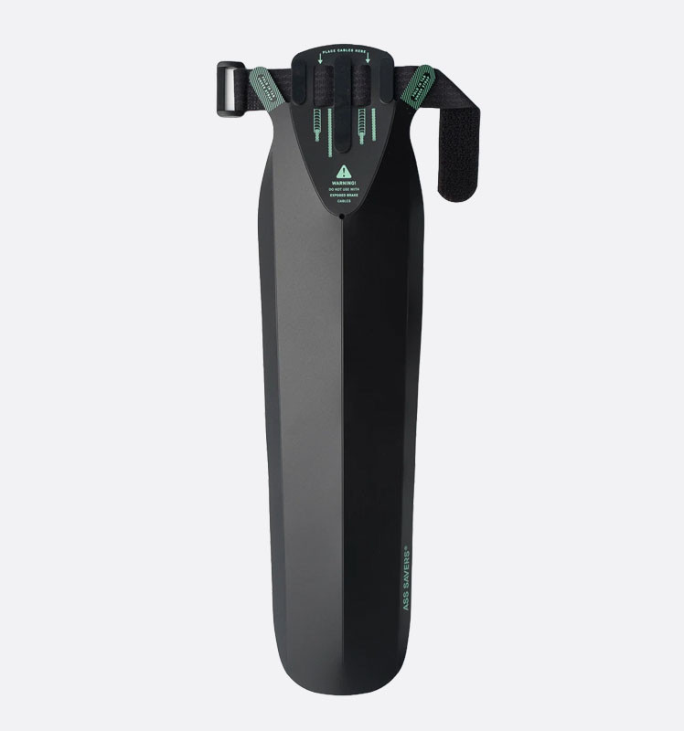 Довгий, майже вертикально розташований бризковик із кріпленням на нижню трубу рами. Його завдання — захищати ноги, трансмісію та каретку від бризок бруду й води з переднього колеса.