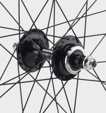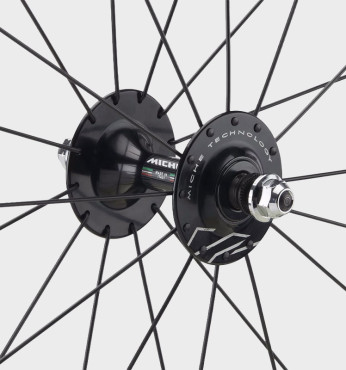 Швидкість і жорсткість – головні риси Miche Pistard. Сет зібрано на алюмінієвих ободах середнього профілю та легких втулках із кованого алюмінію. Радіальне спицювання переднього колеса та перехресне для заднього у поєднанні з високими фланцями втулок й точно вивіреним натягом спиць забезпечують оптимальну жорсткість усієї системи. Якісні підшипники закритого типу («проми») гарантують виняткову плавність обертання.