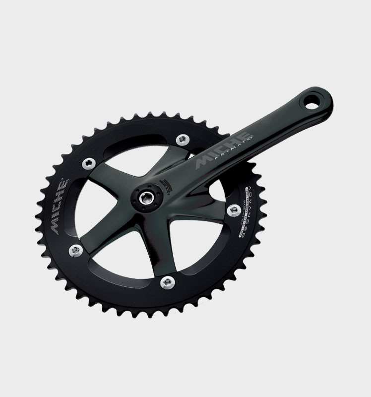 PRIMATO PISTA — одна з найлегших трекових систем на ринку і водночас достатньо жорстка для максимально ефективної передачі потужності. Виготовлена з кованого алюмінію 6082-T6 методом високоточної CNC-обробки. Анодування за технологією TT Total Treatment забезпечує максимальну зносостійкість. Оснащується шатунами довжиною від 165 до 175 мм із павуком на 5 лап під стандарт BCD 144 та зіркою Miche Advanced із діапазоном 44–56 зубців.