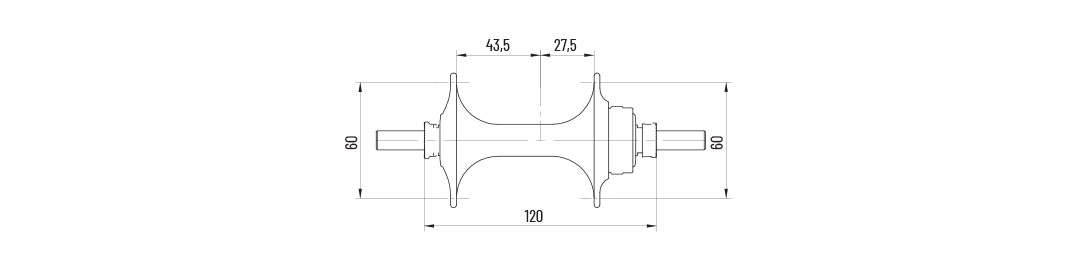 Відстань між фланцями дорівнює 71 мм (зміщення відносно центру 43,5 мм / 27,5 мм). Діаметр фланців – 60 мм. O.L.D. – 120 мм