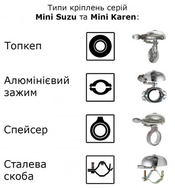 Серія MINI SUZU поєднує в собі компактні розміри, класичний ударний механізм, гучний чистий звук та 4 види кріплення: топкеп, спейсер, металева скоба та алюмінієвий зажим.