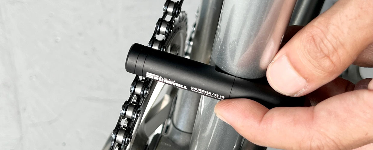 Співставте мітку посередині інструмента з центральною лінією підсідельної труби. Якщо центр ланцюга знаходиться між двома крайніми лініями, чейнлайн витриманий правильно – перебуває в межах 42 ± 2 мм.